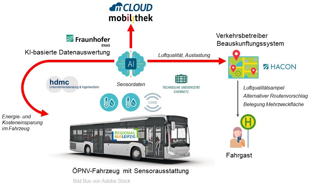 Based on this concept, data will initially be collected during pilot operations, and AI models for data processing and sensor reduction will be developed. Real-time data and forecasts for air quality and occupancy will be prototypically integrated into the existing information system after further development of the public transport information system and evaluated in a friendly user test.